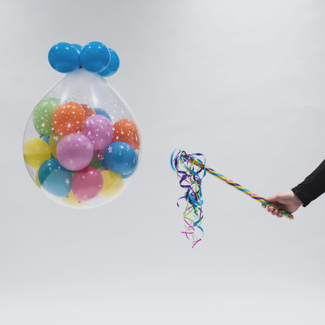 An oversized clear balloon filled with colorful mini balloons for a fun, safe New Year’s Eve countdown. Perfect for kids’ parties, early celebrations, and photo moments. Pop it to ring in the new year with smiles and color. 🎈